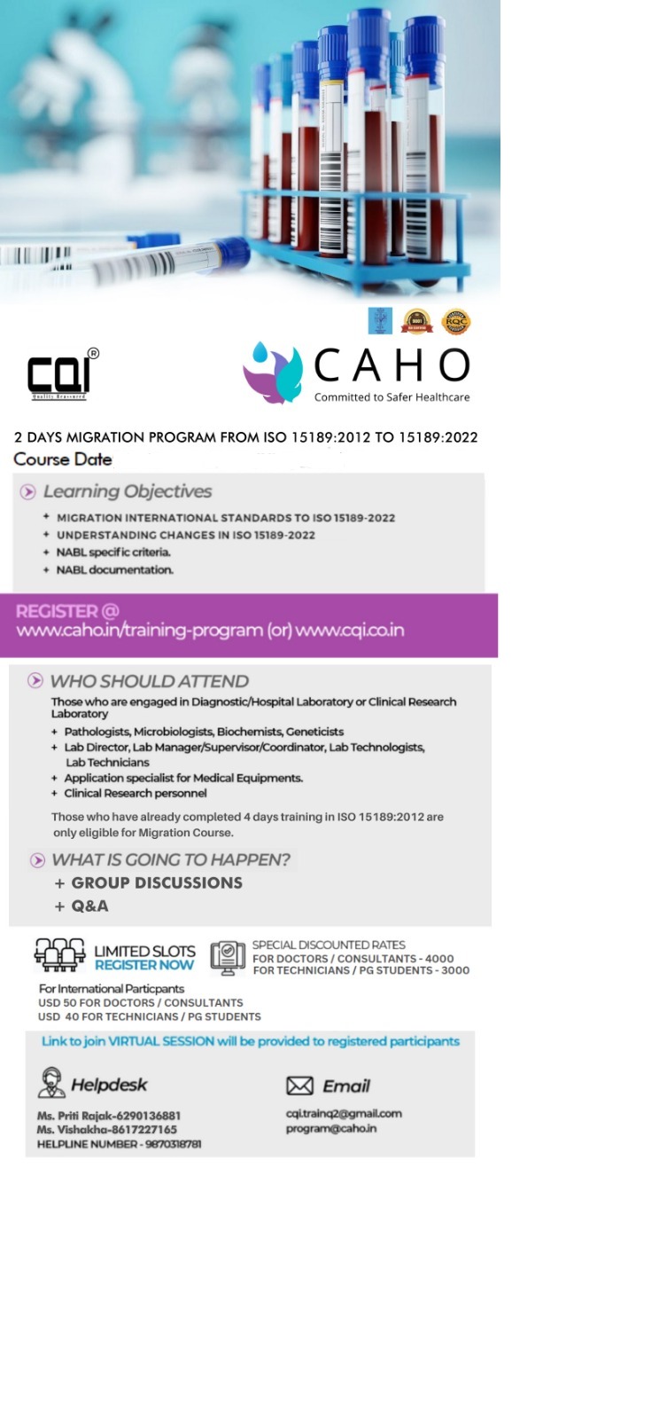 CQI is an intensive training institute of Quality Management system working on internationally accepted standards in the clinical organization setting like Laboratory and Hospitals which ensures quality training by domain experts ensuring customer satisfaction.